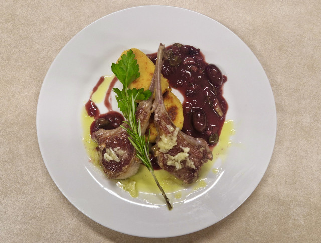 Grilované jahňacie kotlety s rozmarínovou polentou a vínovou redukciou s kaparami a olivami